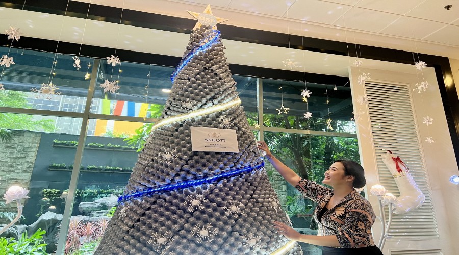 TrenBisnis.co, Jakarta – 12 Desember 2023 – memasuki bulan Desember banyak beberapa tempat mempercantik area publik untuk menyambut Natal, termasuk area lobby Ascot Jakarta. Ascott Jakarta yang berlokasi di Jl. Kebon Kacang Raya No.2 ini properti pertama Ascott Indonesia yang tampak lebih indah dan cerah dengan hiasan perpaduan warna silver dan biru tua. Saat dilihat lebih dekat, pohon Natal ini tampak berbeda seperti dijelaskan oleh Vanessa Velindra, Marketing & Brand Manager di Ascott Jakarta, pohon Natal tahun ini terbuat dari kemasan telur bekas.